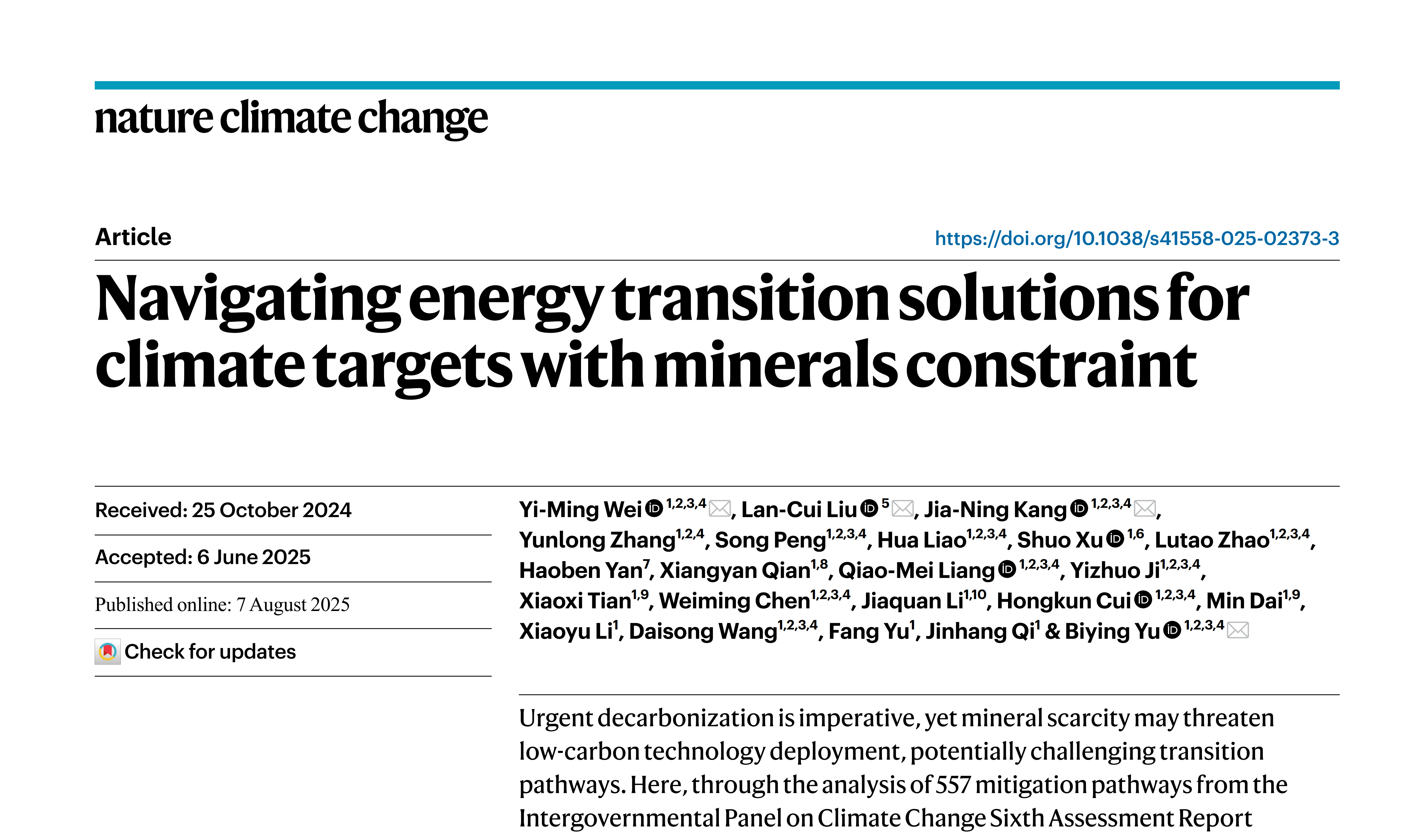Navigating energy transition solutions for climate targets with minerals constraint.Authors:Wei Yi-Ming, Lan-Cui Liu, Jia-Ning Kang, Yunlong Zhang, Song Peng, Hua Liao, et al.Journal:Nature Climate Change -